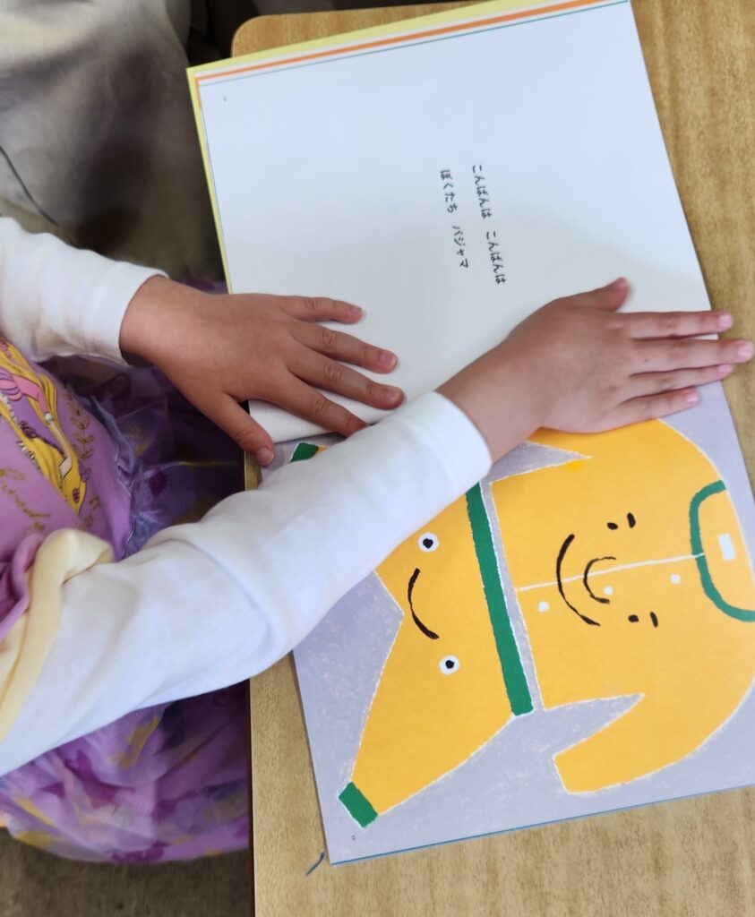 これは読書指導のスタートですが、まだ絵本(本)に興味がないお子様や、じっと座っていられないかもしれない心配があっても、正しく文章を読まなければ!と完璧を求めずに、少しの時間から始められます。1ページずつ自分でめくるだけでも案外難しいものです。力加減や指手指の使い方が慣れておらず、めくる時に一度にたくさんページを掴んでしまうこともありますが、だいじょうぶ!ノビントスのレッスンでも、最初はだいたい3回ページくらいをめくることができれば、上出来です。慣れてくれば、次は、5ページ、7ページと少しずつ増やしていくので安心して進んでいけます。ストーリーを最後まで読めなくてもだいじょうぶ♪同じ絵本を何度も一緒に楽しく開いてみてください♪だんだんと、「読書」の行動が子どもたちに馴染んできます。ページをめくること一つとっても、指先を使う作業なので手先も器用になり一石二鳥です♫