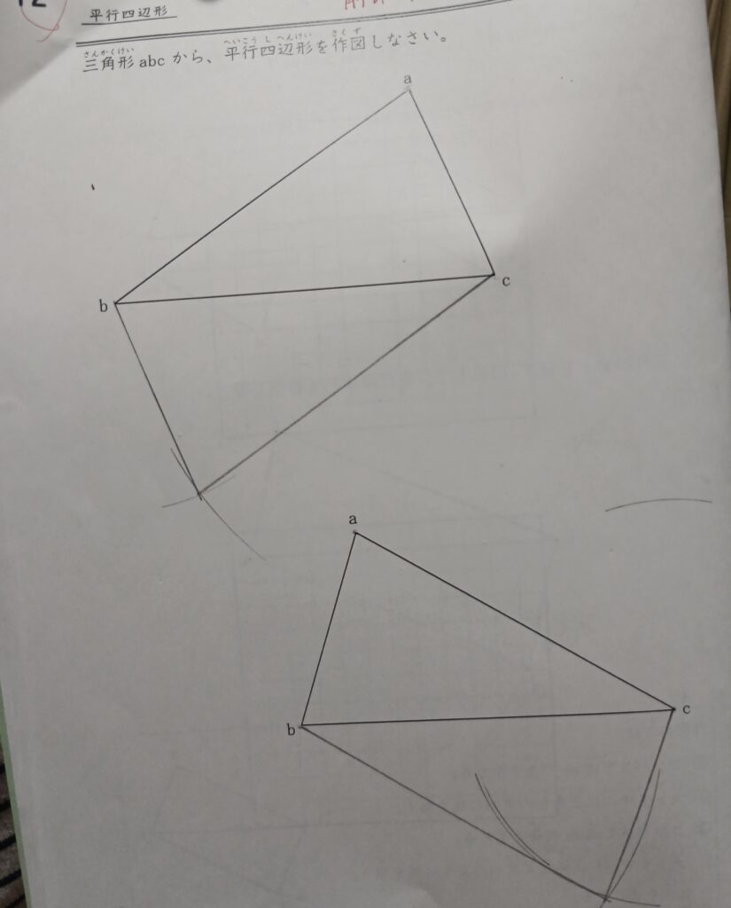三角形から平行四辺形ができた💡✨それから 線分を等分割することまでができるようになったよ♪四年生さん ニコニコです♪