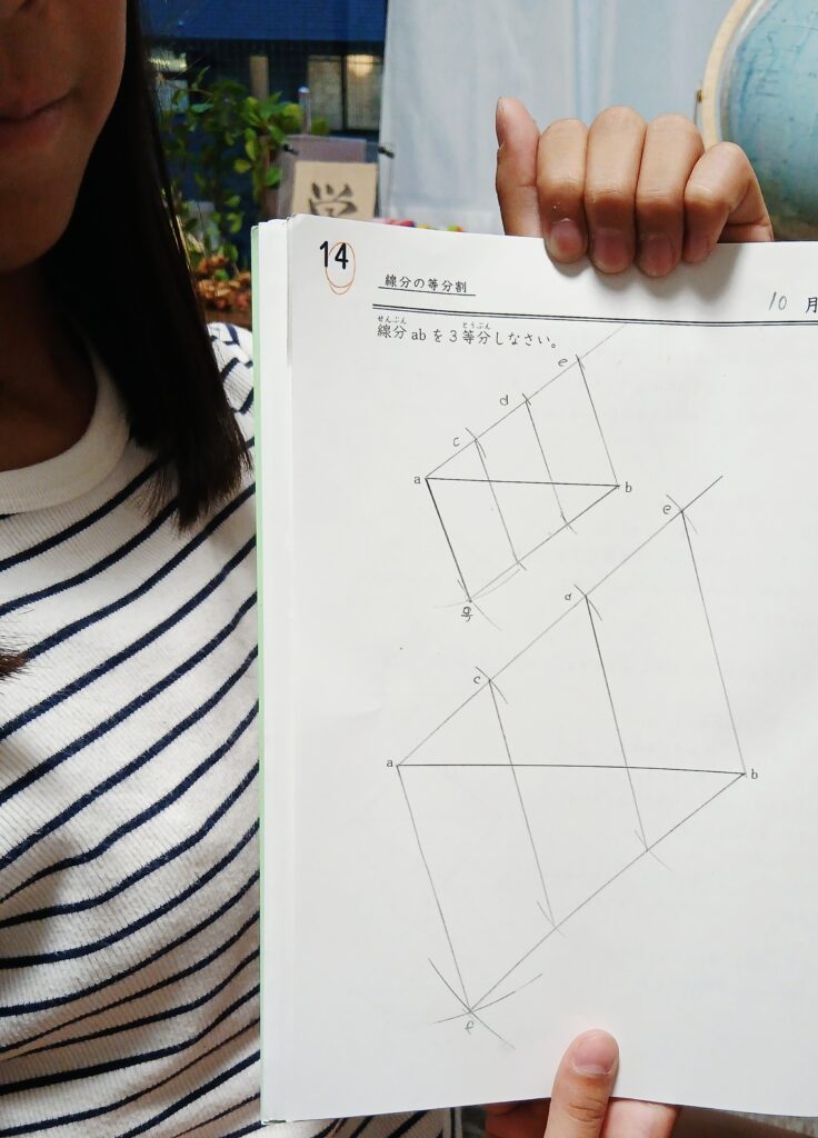 なかなか作図のワークブックが進まなくて、おもしろくないよ…こんなの…説明文読むのも大変だよ…というお顔だった時期も続いてた4年生のTちゃん。気持ちがダウンしても、また寄り添って一緒に読んで、一緒に考えて、一緒に描いて…と続けてきました。ホームワークが進まなくても、「一緒にやってみよう♪」と毎週毎週コツコツと描きました。