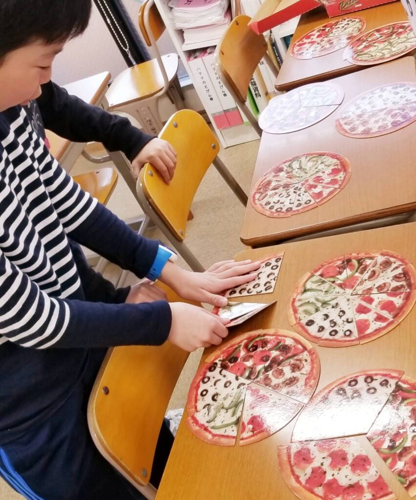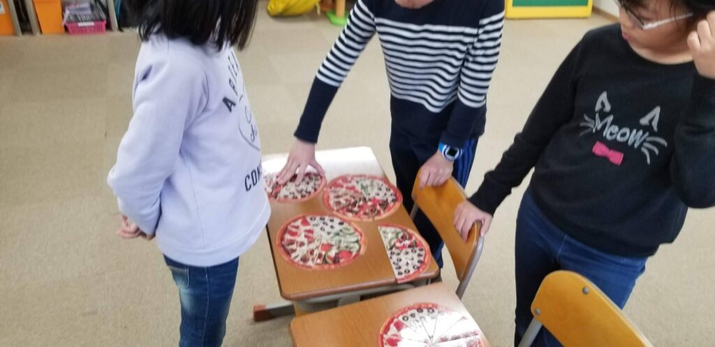 「分数はピザを分けることで教えてくれたね!」「そうそう!わかりやすかった!」「おいしそうなピザのカードがあったよね~~!」と笑顔で話してくれました。
