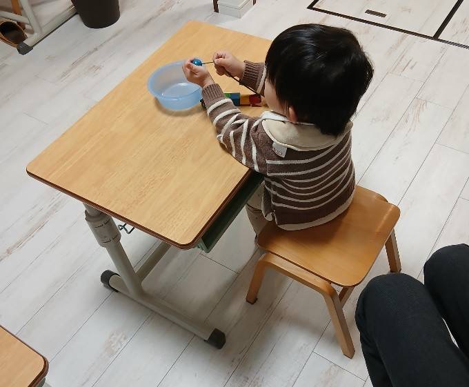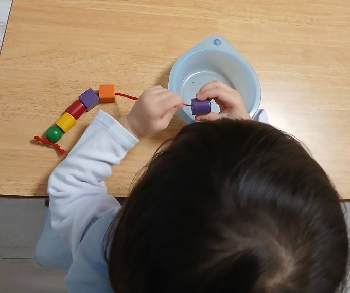 小さな穴にヒモを通します。遊びながら指先調整を行います。