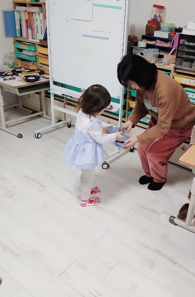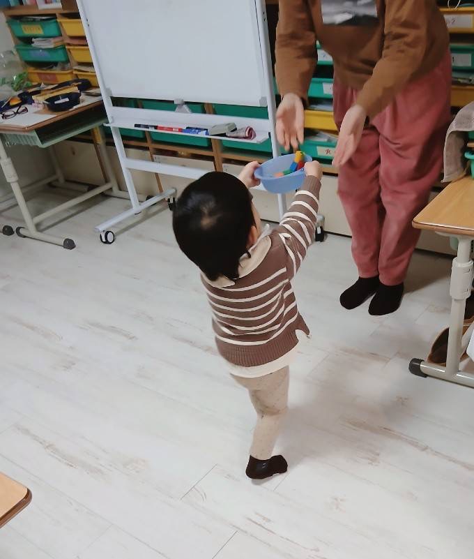 使ったあとは、両手を添えて渡します。1歳半クラスから、丁寧にものを渡すことを伝えています。
